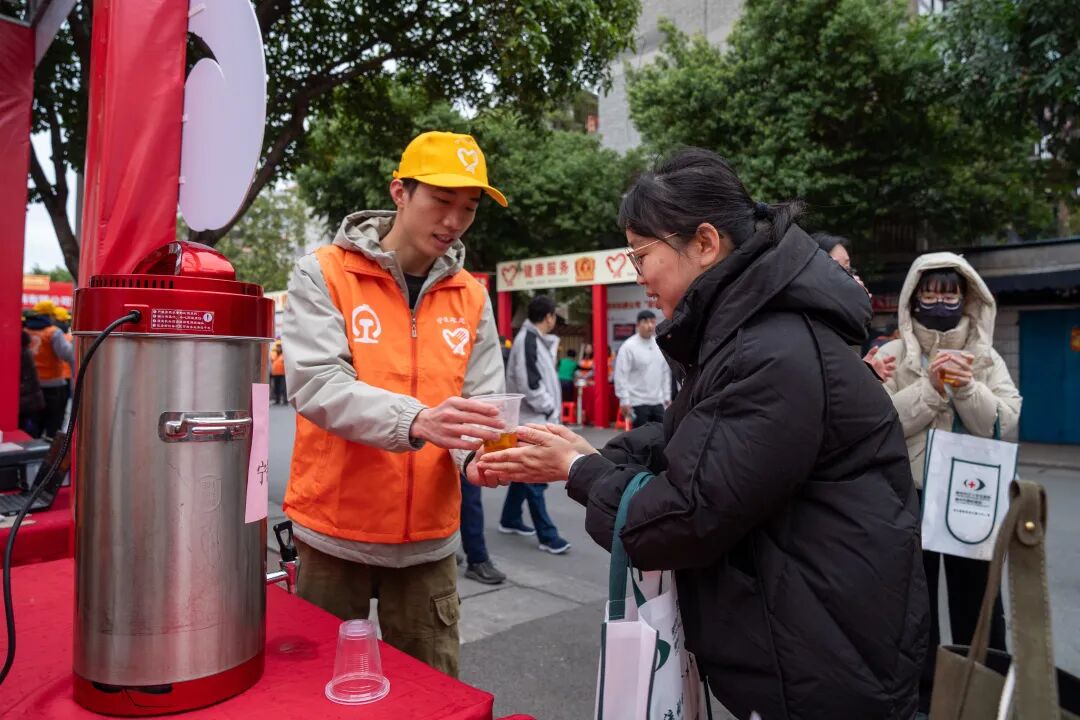 柳州“雷锋街市”青年志愿者为路过的群众送上姜糖水。兰炳侣 摄
