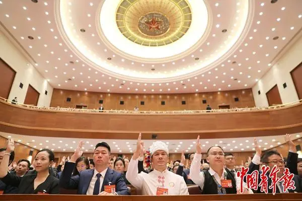 7月3日,全国青联十四届全委会闭幕会会场,青联委员们举手表决相关决议。中青报·中青网记者 陈剑/摄