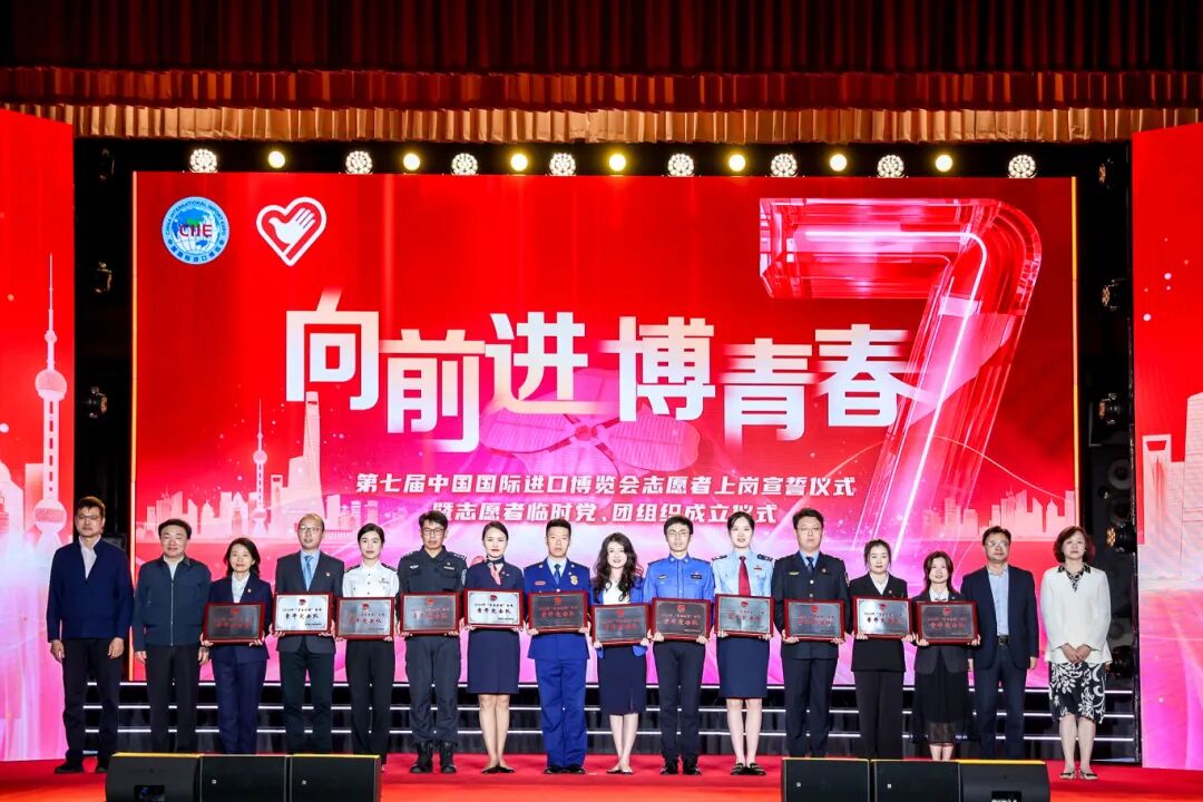 仪式上,上海市政府副秘书长、第七届进博会志愿者服务保障组组长赵祝平为进博会志愿者总队授旗,团中央青年志愿者行动指导中心党委书记张朝晖、团上海市委书记上官剑为第七届进博会党、团员先锋岗志愿者代表颁发先锋岗旗帜。