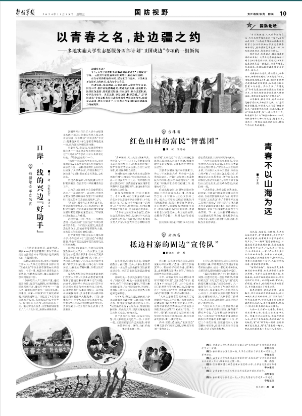 来源:《解放军报》2024年11月13日10版,《中国国防报》2024年11月13日03版(记者:胡铮、杨明月、段锐、宋济舟、杨白冰、余黎),原标题《以青春之名,赴边疆之约——多地实施大学生志愿服务西部计划“卫国戍边”专项的一组新闻》