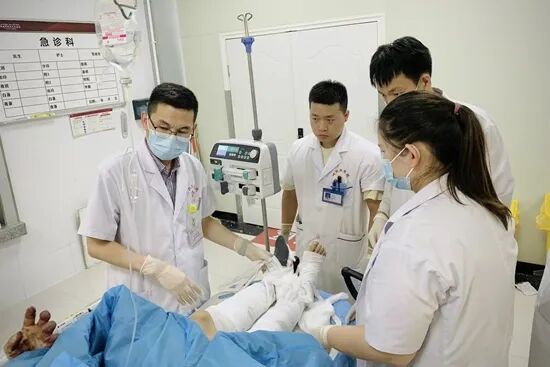 新疆阿拉尔,阿拉尔医院急诊科副主任乔金保正在教年轻医生做创伤评估。受访者供图