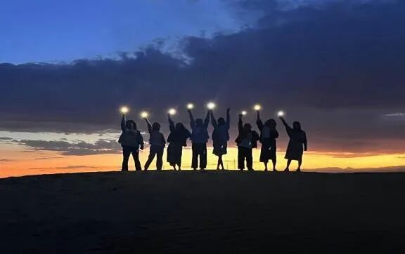 最难忘的,是服务结束前一次说走就走的敦煌之旅。我与几位同事一起并肩爬上了鸣沙山,尽管攀登的过程中,风沙不时地侵袭着我们,满身满脸都沾满了细细的沙土,头发凌乱,汗水与沙粒交织在一起,但我们毫不介意,反而因为这份共同经历的“狼狈”而开心大笑。当我们站在山顶瞭望远方,鸣沙山在夕阳的照耀下更显雄浑与壮丽,那份成就感与自由感无以言表。在那宁静而壮美的背景下,一支骆驼队缓缓行进在鸣沙山的轮廓线上,如同一串悠长的音符,在沙漠的乐章中缓缓流淌。骆驼们迈着沉稳的步伐,踏着松软的沙地,留下一串串深浅不一的足迹,仿佛是时间的印记,记录着我在西部土地上扎扎实实的一年。