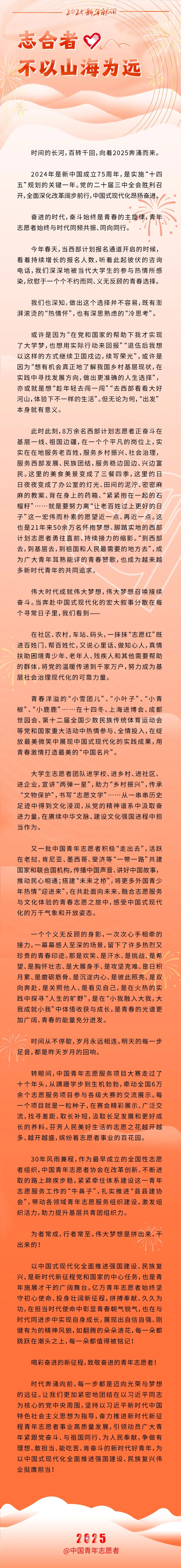 2024年是新中国成立75周年,是实施“十四五”规划的关键一年。党的二十届三中全会胜利召开,全面深化改革阔步前行,中国式现代化昂扬奋进。奋进的时代,奋斗始终是青春的主旋律,青年志愿者始终与时代同频共振、同向同行。今年春天,当西部计划报名通道开启的时候,看着持续增长的报名人数,听着此起彼伏的咨询电话,我们深深地被当代大学生的参与热情所感染,欣慰于一个个不约而同、义无反顾的青春选择。我们也深知,做出这个选择并不容易,既有澎湃滚烫的“热情怀”,也有深思熟虑的“冷思考”。或许是因为“在党和国家的帮助下我才实现了大学梦,也想用实际行动来回报”“退伍后我想以这样的方式继续卫国戍边,续写荣光”,或许是因为“想有机会真正地了解我国乡村基层现状,在实践中寻找发展方向,做出更准确的人生选择”,亦或就是想“趁年轻去闯一闯”“去西部看看大好河山,体验下不一样的生活”。但无论为何,“出发”本身就有意义。此时此刻,8万余名西部计划志愿者正奋斗在基层一线、祖国边疆,在一个个平凡的岗位上,实实在在地服务老百姓,服务乡村振兴、社会治理,服务西部发展、民族团结,服务稳边固边、兴边富民。这里的美食美景变成了三餐四季,这里的日日夜夜变成了办公室的灯光、田间的泥泞、密密麻麻的教案、背在身上的药箱、“紧紧抱在一起的石榴籽”……就是要努力离“让老百姓过上更好的日子”这一宏伟而朴素的愿望近一点、再近一点。这也是21年来50余万名怀抱梦想、脚踏实地的西部计划志愿者勇往直前、持续接力的缩影。“到西部去,到基层去,到祖国和人民最需要的地方去”,成为广大青年耳熟能详的青春赞歌,也成为越来越多新时代青年的共同追求。伟大时代成就伟大梦想,伟大梦想召唤接续奋斗。当奔赴中国式现代化的宏大叙事分散在每个寻常日子里,我们看到——在社区、农村,车站、码头,一抹抹“志愿红”既进百姓门、帮百姓忙,又说心里话、做知心人,真情扶助困境青少年、老年人、残疾人和其他需要帮助的群体,将党的温暖传递到千家万户,努力成为基层社会治理现代化的可靠力量。青春洋溢的“小雪团儿”、“小叶子”、“小青椒”、“小鹿鹿”……在十四冬、上海进博会、成都世园会、第十二届全国少数民族传统体育运动会等党和国家重大活动中热情参与、全情投入,在绽放最美微笑中展现中国式现代化的实践成果,用青春激情打造最美的“中国名片”。大学生志愿者团队进学校、进乡村、进社区、进企业,宣讲“两弹一星”,助力“乡村振兴”,传承“文物保护”,书写“志愿文学”……从一串串历史足迹中得到文化浸润,从党的精神谱系中汲取奋进力量,在赓续中华文脉、建设文化强国进程中担当作为。又一批中国青年志愿者积极“走出去”,活跃在老挝、肯尼亚、墨西哥、斐济等“一带一路”共建国家和联合国机构,传播中国声音、讲好中国故事,推动民心相通;搭建“未来之桥”,将更多外国青少年热情“迎进来”,在共赴面向未来、融合志愿服务与文化体验的青春志愿之旅中,感受中国式现代化的万千气象和开放姿态。一个个义无反顾的身影,一次次心手相牵的接力,一幕幕感人至深的场景,留下了许多热烈又珍贵的青春印迹。那是欢笑、是汗水、是挑战、是希望、是胸怀壮志、是大展身手、是攻坚克难、是日积月累、是磨砺筋骨、是沉淀内心、是彼此照亮、是双向奔赴、是关照他人、是看见自己,是在火热的实践中探寻“人生的旷野”,是在“小我融入大我,大我成就小我”中体悟收获与成长,是青春的光谱更加广阔、青春的能量充分迸发。时间从不停歇,岁月永远相连。明天的每一步足音,都是昨天岁月的回响。转眼间,中国青年志愿服务项目大赛走过了十个年头,从蹒跚学步到生机勃勃,牵动全国6万余个志愿服务项目参与各级大赛的交流展示。每一个项目就是一粒种子,在赛会精彩展示、广泛交流,找寻差距、取长补短,汲取长足发展和更好成长的养料。芬芳人民美好生活的志愿之花越开越多、越开越盛,缤纷着志愿者事业的百花园。30年风雨兼程,作为最早成立的全国性志愿者组织,中国青年志愿者协会在改革创新、不断进取的路上蹄疾步稳,紧紧牵住体系建设这一青年志愿服务工作的“牛鼻子”,扎实推进“县县建协会”,带动各领域青年志愿服务组织建设,激发组织活力,助力提升基层共青团组织力。以中国式现代化全面推进强国建设、民族复兴,是新时代新征程党和国家的中心任务,也是青年施展才干的广阔舞台。亿万青年志愿者始终坚守初心使命、投身壮阔新征程,拼搏奉献、久久为功,在担当时代使命中彰显青春朝气锐气,也在与时代同进步中实现自身成长,展现出自信自强、刚健有为的精神风貌,如翻腾的朵朵浪花,每一朵都跳跃在潮头之上,每一朵都值得被铭记!