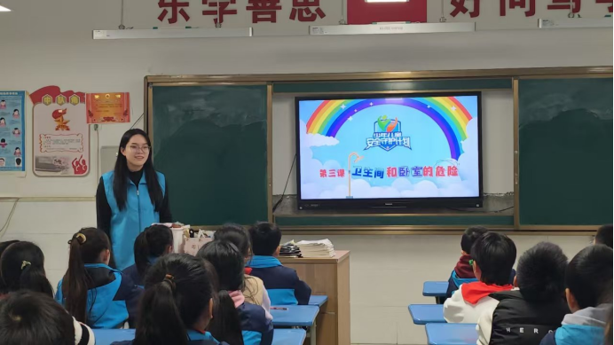 在《卫生间和卧室的危险》课堂,志愿者孙映林妙招频出。她先是借助形象的洗澡操,分享保持平衡的窍门;接着趣味小实验登场,孩子们拿起沐浴球感受摩擦力对防滑的关键作用,恍然大悟间牢记卫生间防摔要点。切换至卧室板块,孙映林将晦涩的管道问题深入浅出讲解,把管道比作房屋“血管”,让孩子们轻松理解堵塞、漏水危害,一堂课兼具知识传授与生命教育,为孩子们的健康成长保驾护航。